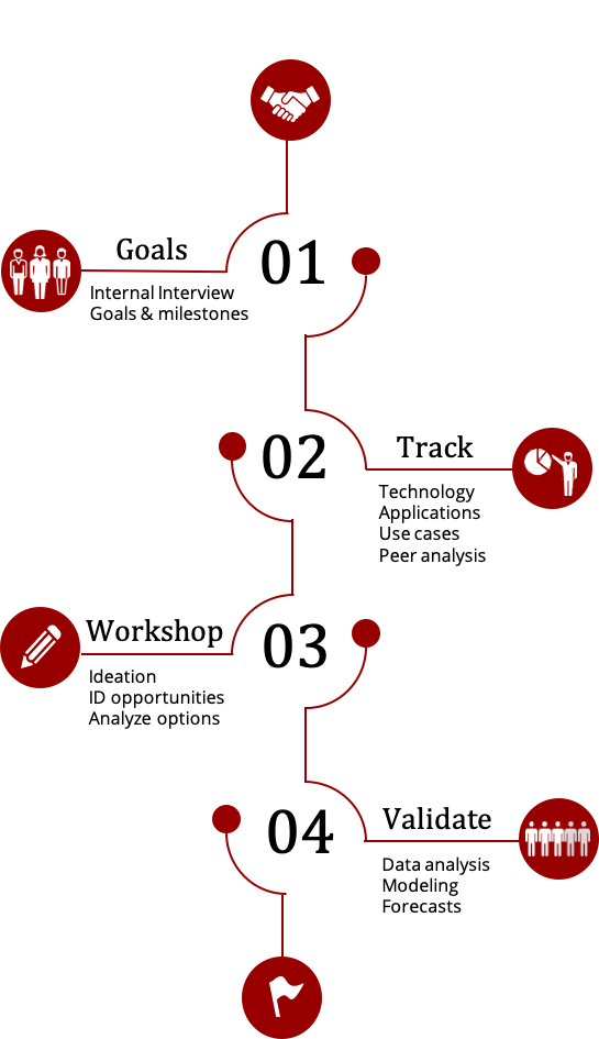 We interacted with our client’s team on a quarterly basis to re-fresh the critical topics, technologies and players to be tracked. By doing so, we were able to work with our client to tie this intelligence effort to their goals and intended growth strategy.